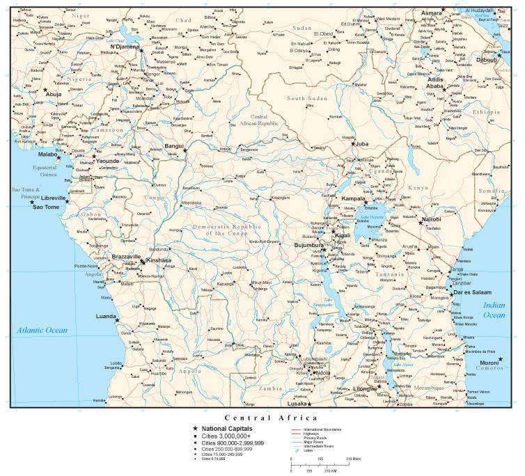 Central Africa Map with Country Boundaries, Capitals, Cities, Roads and Water Features